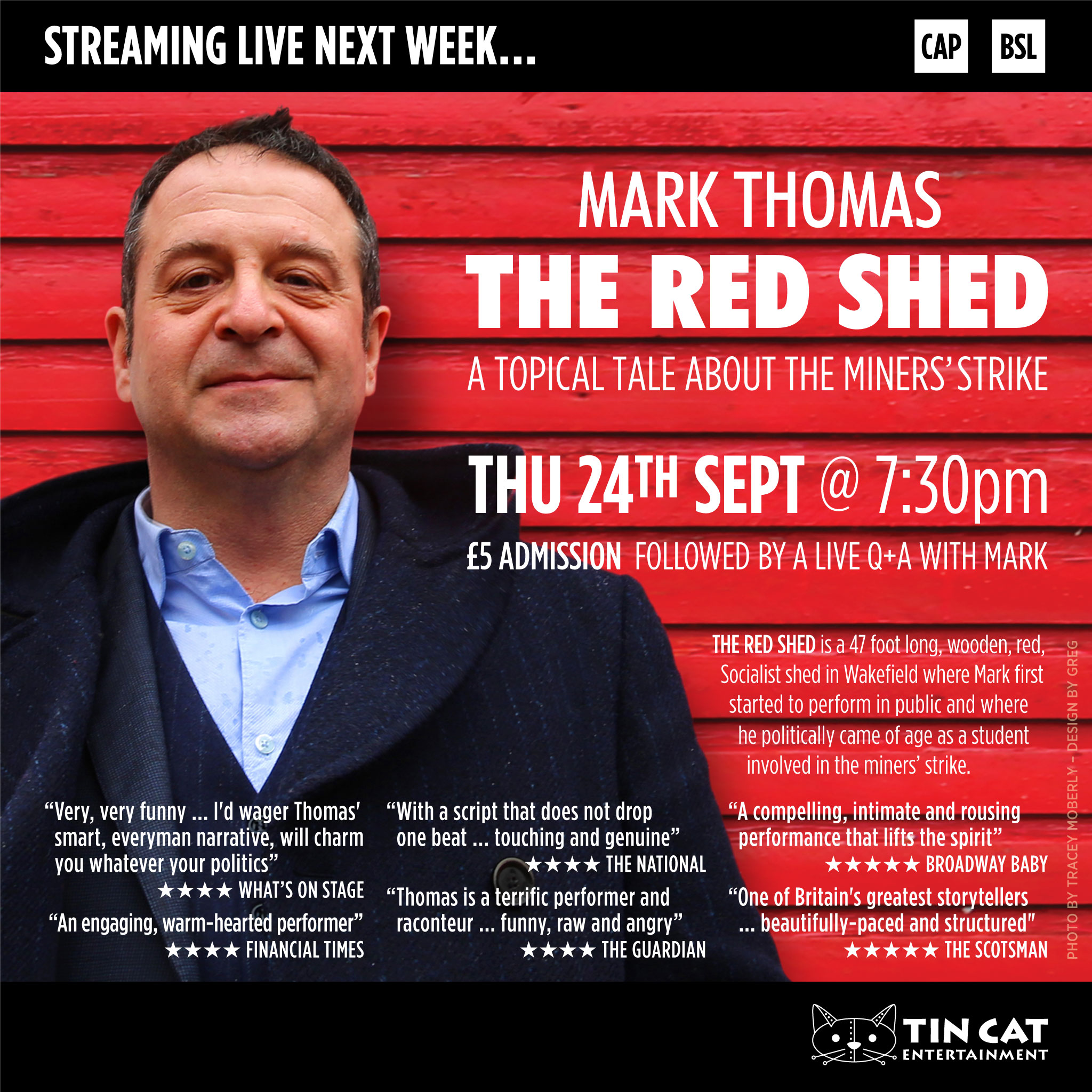 The Red Shed is part of Mark’s theatrical trilogy, following the much-revered Bravo Figaro and Cuckooed. Mark returned to the place where it all began – the Red Shed, a labour club in Wakefield – to celebrate the club’s 50th birthday as he continued his tour in 2017 of yet another award-winning, highly acclaimed performance.