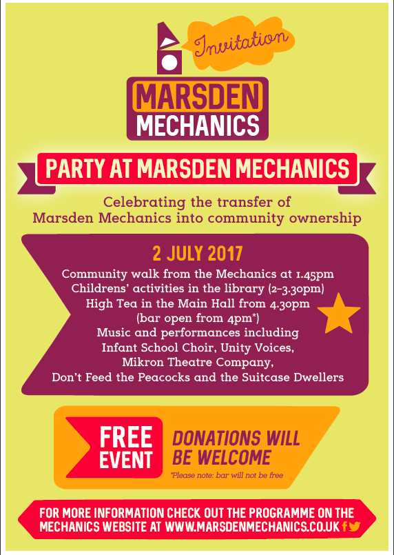 Many a Marsdener has spent happy times in the Mechanics, from the Jazz Festival to the Big Village Quiz, the best mate’s wedding, or an evening yoga class. (And it’s home to our very special Library of course). And now it belongs to the Village, so it’s time for a party. Before the hard work of keeping it going really begins!
