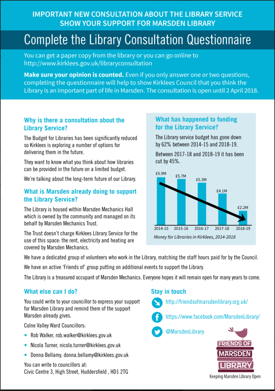 Friends of Marsden Library strongly encourages everyone in Marsden to complete the consultation questionnaire, and has provided supporting information for every household in Marsden (with thanks to the Cuckoo’s Nest).