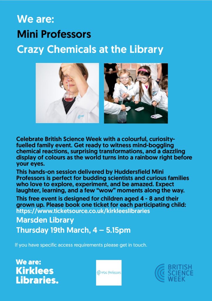 Delivered by Huddersfield Mini Professors and perfect for budding scientists and curious families who love to explore, experiment, and be amazed.