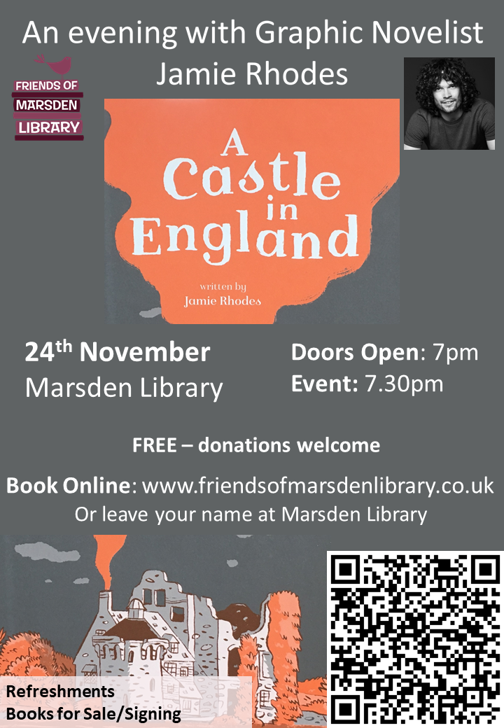 for an evening with graphic novelist Jamie Rhodes. Jamie will read an extract from his graphic novel, “A Castle in England” and tell us about the project that inspired it, in which he spent 4 months living in a National Trust castle creating stories inspired by the objects and documents in its archive, plunging us into its rich and often dark history.