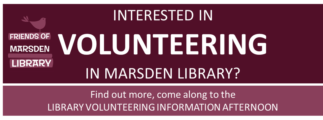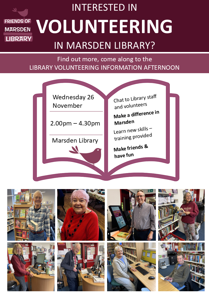 Volunteers are an essential part of keeping Marsden Library open and new volunteers are always welcome. You would work alongside a member of staff, and you would receive full training. If you would like to find out more, drop in to the Information Afternoon on 26th November. If you’re interested, but can’t make it, just drop us a line – info@friendsofmarsdenlibrary.org.uk.