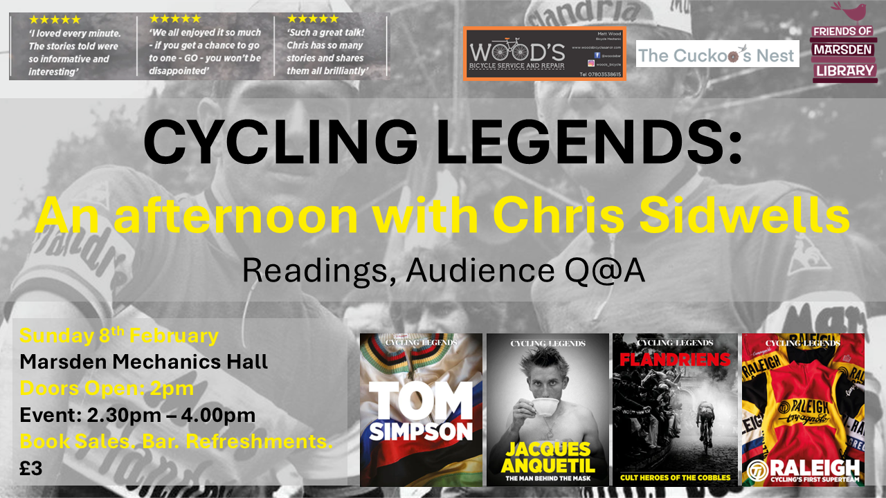 Presented with thanks to our sponsor, Wood's Bicycle Service and Repair, and supported with grant funding from the Cuckoo's Nest, Marsden Love riding your bike - it's a Sunday afternoon - why not do a social ride to join us (plenty of space for bike parking on the Cobbles outside the Mechanics)? Booking Link: […] |